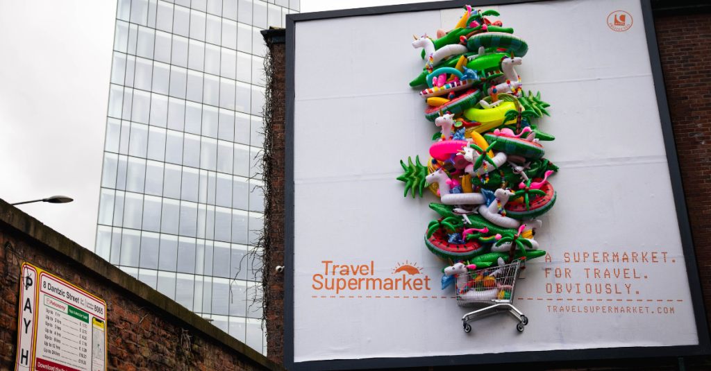 TravelSupermarket has captured public attention with a unique advertising strategy that incorporates recycled inflatable beach toys into a five-metre-high 3D billboard in central Manchester. This advertisement, part of the company’s first integrated campaign in over five years, prominently features a supermarket trolley overflowing with a 20ft stack of beach toys and the clever tagline: ‘It’s a supermarket. For travel. Obviously.’